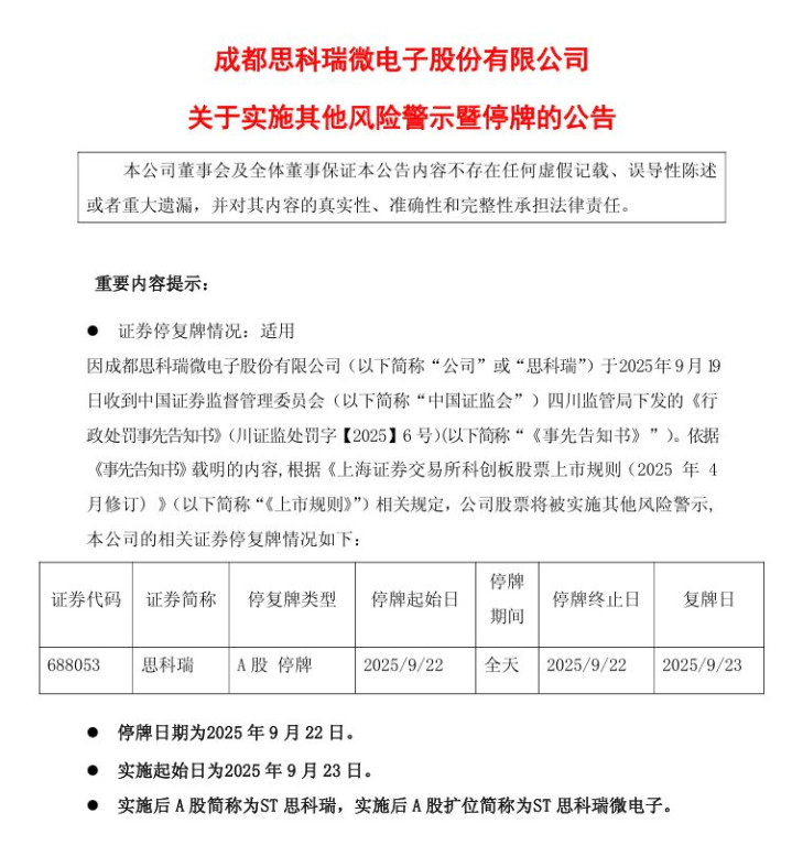 该行为涉嫌违反《证券法》相关规定,构成违法行为。根据《上市规则》相关规定,思科瑞股票将被实施其他风险警示,A股简称变更为ST思科瑞,扩位简称变更为ST思科瑞微电子。停牌日期为2025年9月22日,实施起始日为2025年9月23日。实施风险警示期间,公司股票不进入上海证券交易所风险警示板交易,投资者当日通过竞价交易、大宗交易和盘后固定价格交易累计买入的公司股票数量不得超过50万股。